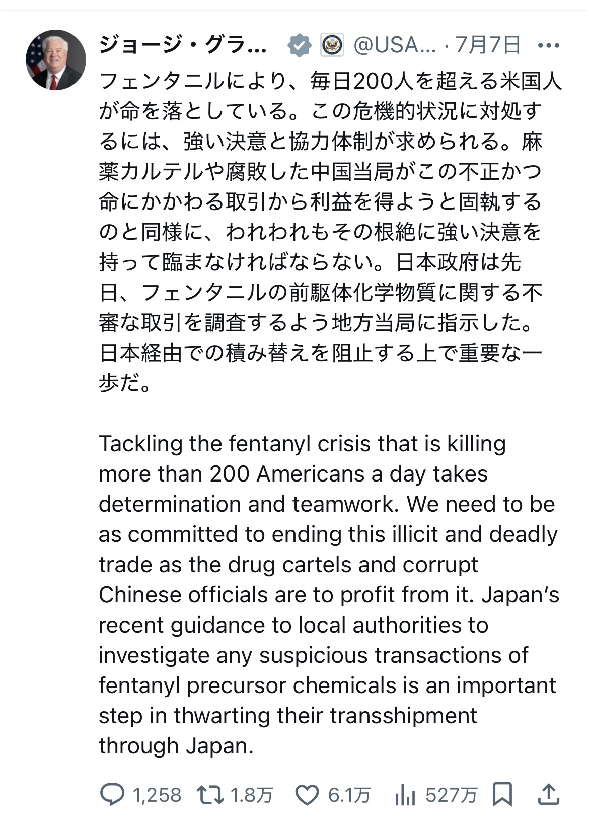 ジョージ・グラス駐日米大使も7月7日にX(旧ツイッター)にてフェンタニルについて投稿している(日本に何かを期待している?)