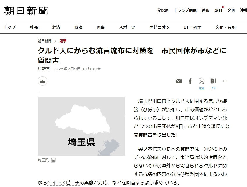 浅野真 2025年7月9日 11時00分埼玉県川口市でクルド人に関する流言や誹謗(ひぼう)が流布し、市の価値がおとしめられているとして、川口市民オンブズマンなど七つの市民団体が8日、市と市議会議長に公開質問書を提出した。