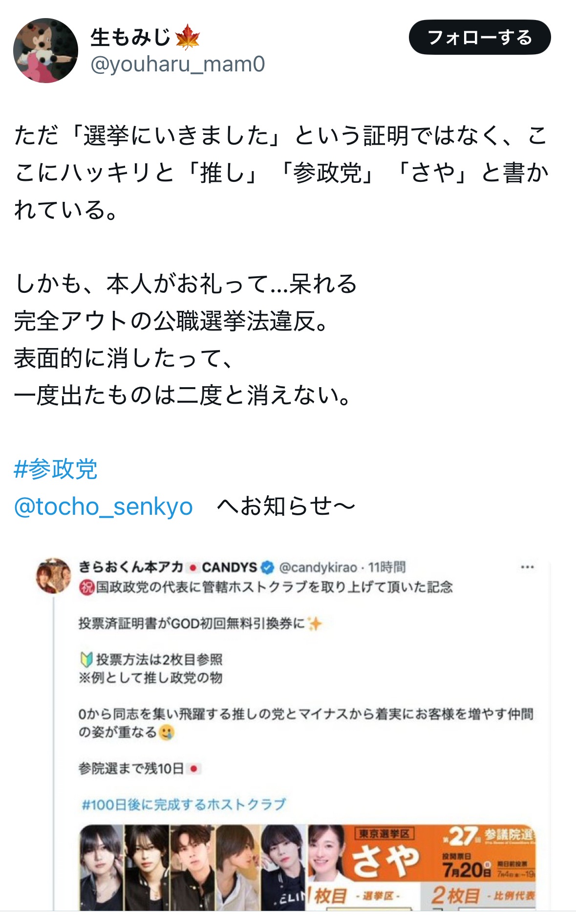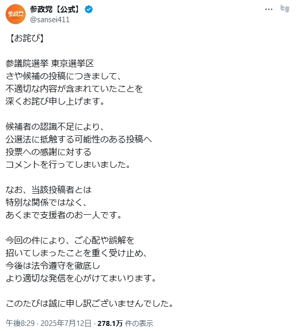 【速報】参政党「謎の新人」さや氏、ガチの公職選挙法違反では?と指摘 参政党公式が謝罪声明を発表→