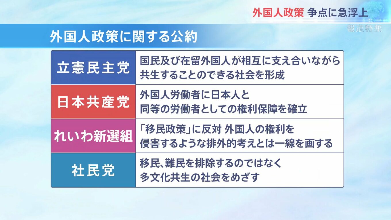 参政党は「外国人が優遇されている」などと訴え、犯罪や生活保護について強硬な主張を繰り返す。