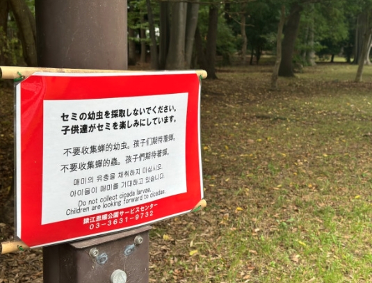 都内の公園でセミの幼虫が乱獲される事案が相次ぎ、公園管理者が「採取禁止」を呼び掛ける張り紙を掲示した。公園では深夜に外国人が採取する目撃情報が寄せられ、張り紙には中国語なども併記した。過去には食用目的での採集を禁止した自治体もあり、管理者側は「目的は不明だが、夜間巡回中に大量採集を確認したこともある」としている。