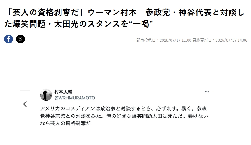 1: 名無し 2025/07/17(木) 15:23:14.14 ID:G9LbNUIj97月14日、YouTubeチャンネル「TBS NEWS DIG Powered by JNN」で、爆笑問題・太田光(60)と参政党の代表・神谷宗幣参院議員(47)の対談動画が公開された。《アメリカのコメディアンは政治家と対談するとき、必ず刺す。暴く。参政党神谷宗幣との対談をみた。俺の好きな爆笑問題太田は死んだ。暴けないなら芸人の資格剥奪だ》