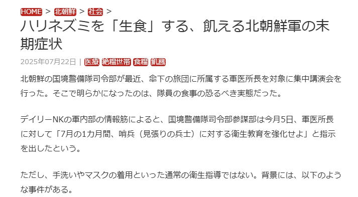 1: 名無し 2025/07/22(火) 08:28:33.67 ID:2+gPoAys0 BE:754019341-PLT(12346)ハリネズミを「生食」する、飢える北朝鮮軍の末期症状北朝鮮の国境警備隊司令部が最近、傘下の旅団に所属する軍医所長を対象に集中講演会を行った。そこで明らかになったのは、隊員の食事の恐るべき実態だった。