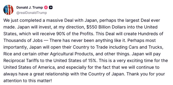 【速報】トランプ大統領SNS投稿「日本と関税15%で合意」日本が差し出したものも公開されちゃう「80兆円以上投資、その利益9割アメリカに還元。車、米、農産物の輸入開放」