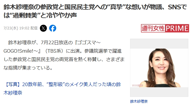 SNSでは“過剰賛美”と冷ややか声鈴木紗理奈が、7月22日放送の『ゴゴスマ~GOGO!Smile!~』(TBS系)に出演。参議院選挙で躍進した参政党と国民民主党の両党首を熱く称賛し、さまざまな指摘が集まっている。