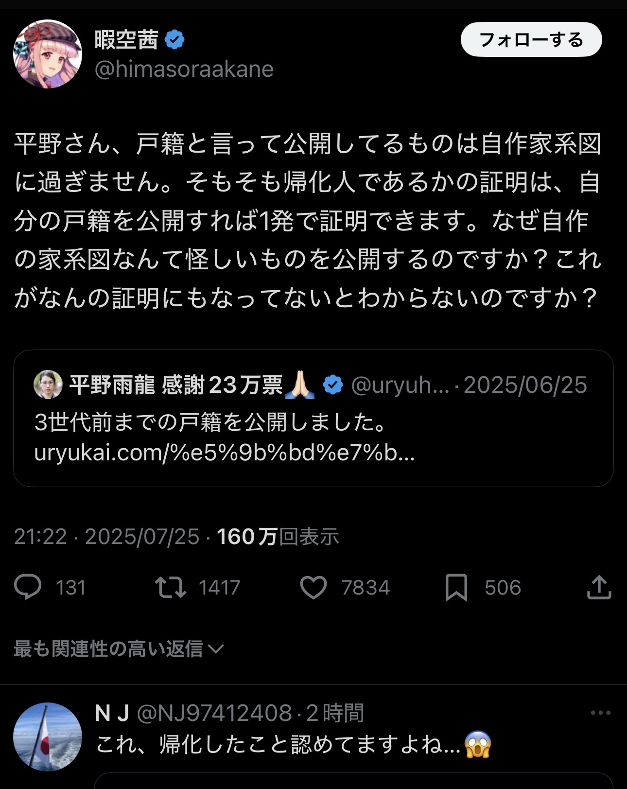 ひろゆき氏が「平野さんも帰化してますけど」って言ってる!! https://t.co/JvDvur5Coa pic.twitter.com/x0M1a6U0a0— じゅんたまのすけ (@Zq3nhl467327) July 25, 2025