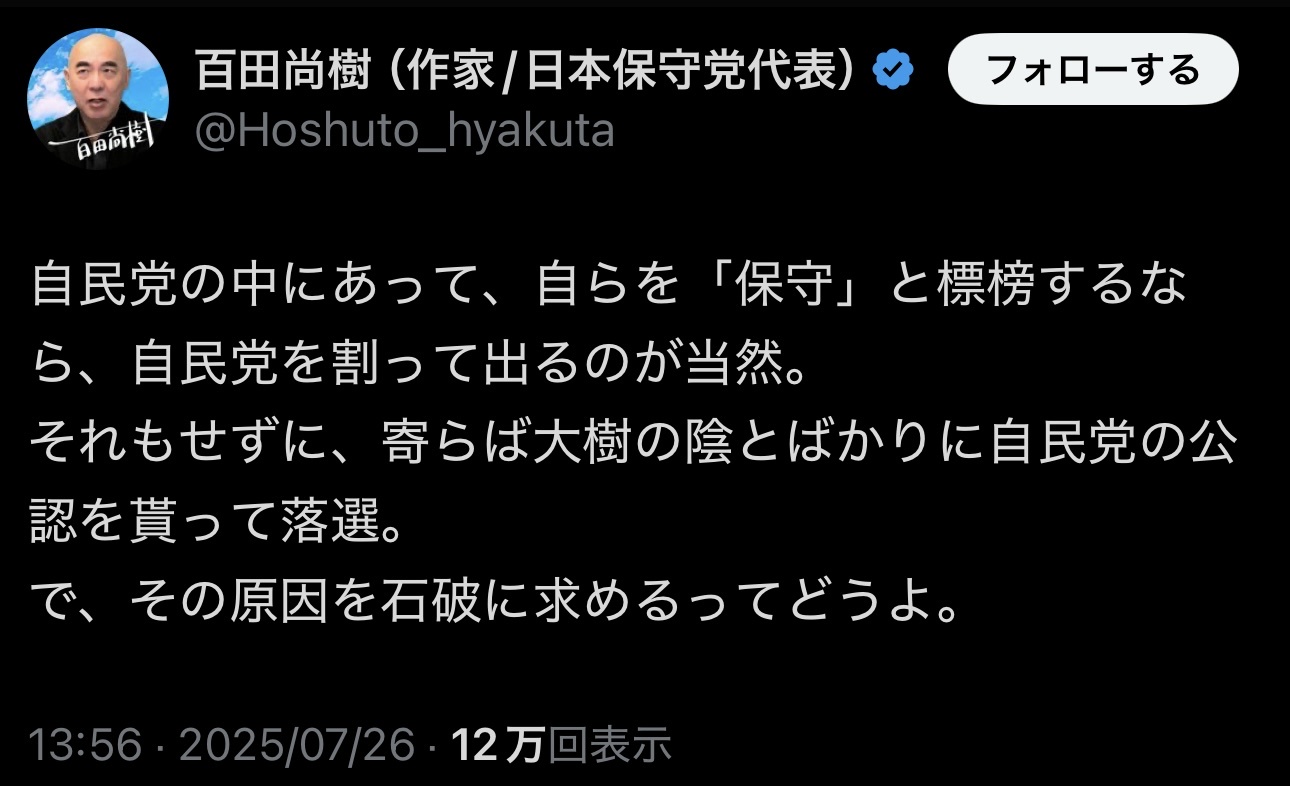 【速報】百田尚樹「公認もらって落選しその原因を石破に求めるってどうよ。自らを保守と標榜するならば割って出ろ」