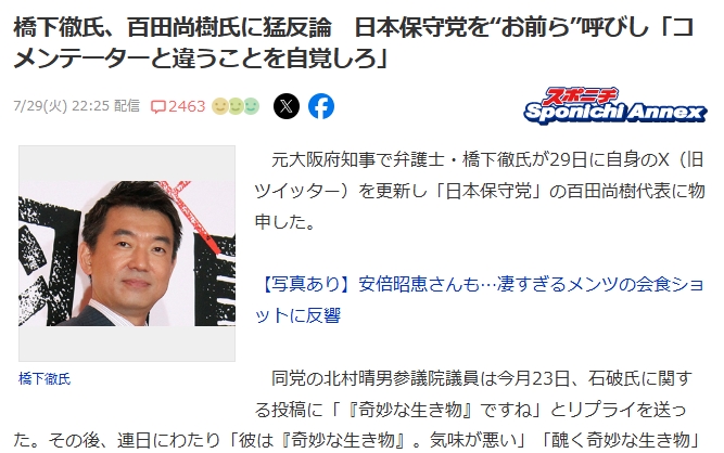 この件について、橋下氏は28日の午前10時ごろに「日本保守党の連中は誹謗中傷が酷すぎる」「発言の仕方を一から勉強しろ」と苦言ポスト。同日午後10時ごろにも「莫大な税金で飯を食い、権力を扱うという公人の自覚のないまま、コメンテーター気分が抜けないバカな国会議員が誕生したということ」と痛烈に批判していた。