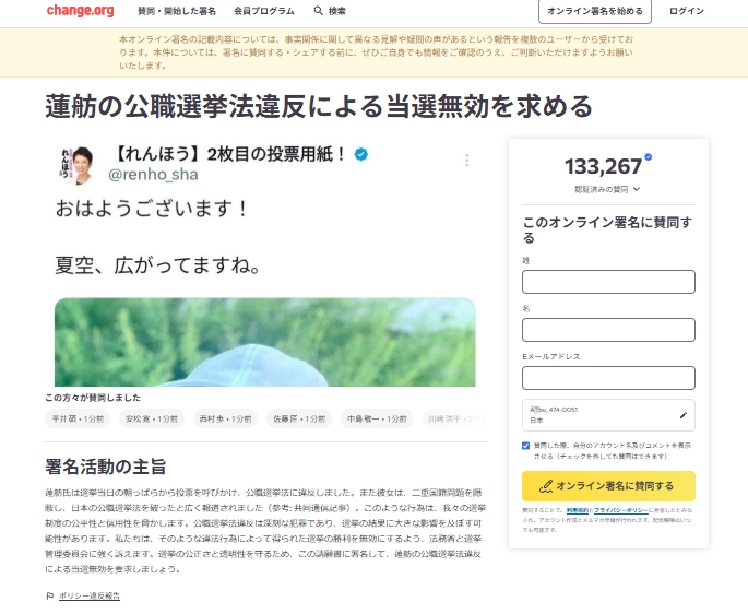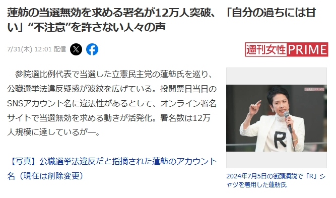 参院選比例代表で当選した立憲民主党の蓮舫氏を巡り、公職選挙法違反疑惑が波紋を広げている。投開票日当日のSNSアカウント名に違法性があるとして、オンライン署名サイトで当選無効を求める動きが活発化。署名数は12万人規模に達しているが─。