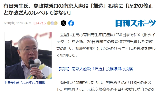 【X】有田芳生氏、参政党議員の南京大虐殺「捏造」投稿に「歴史の修正とか改ざんのレベルではない」