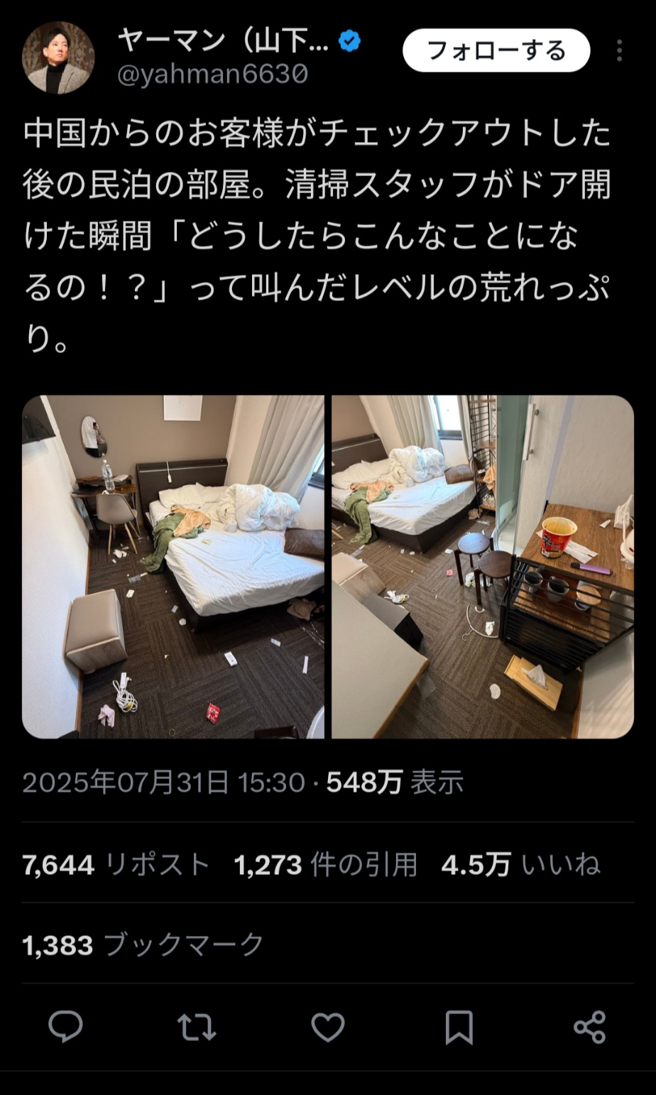 【画像】中国人観光客、民泊を利用して散らかしたままチェックアウトwww