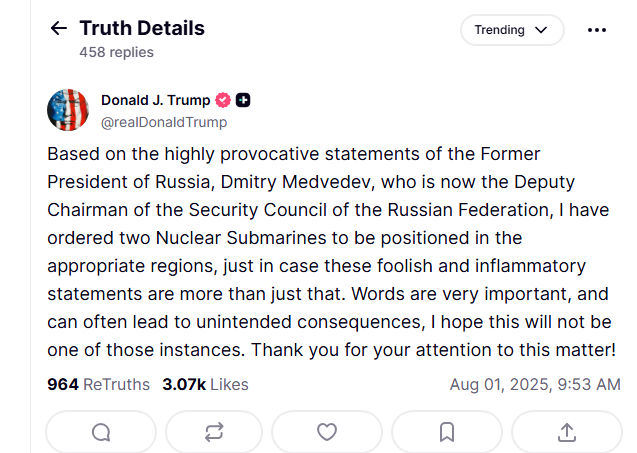 トランプ米大統領は1日、対ロシアの「適切な地域」に原子力潜水艦2隻を派遣すると表明した。