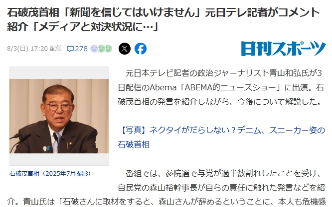 石破氏「新聞を信じてはいけません。自分は辞める気ないのに『辞任へ』て打たれたし」