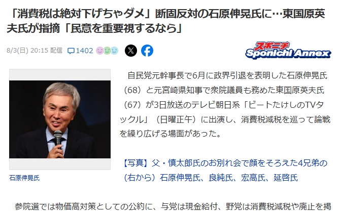 東国原英夫氏が指摘「民意を重要視するなら」自民党元幹事長で6月に政界引退を表明した石原伸晃氏(68)と元宮崎県知事で衆院議員も務めた東国原英夫氏(67)が3日放送のテレビ朝日系「ビートたけしのTVタックル」(日曜正午)に出演し、消費税減税を巡って論戦を繰り広げる場面があった。