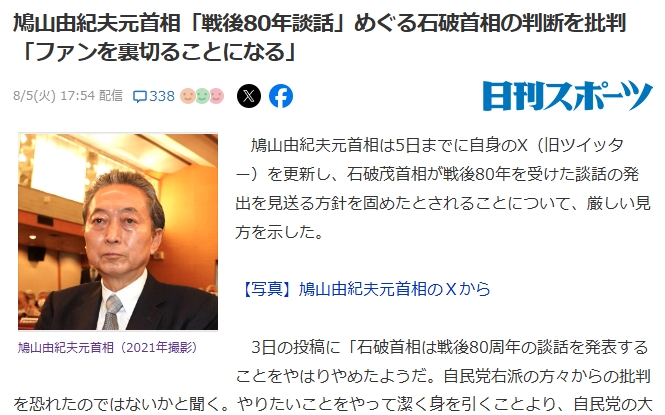 鳩山由紀夫元首相は5日までに自身のX(旧ツイッター)を更新し、石破茂首相が戦後80年を受けた談話の発出を見送る方針を固めたとされることについて、厳しい見方を示した。3日の投稿に「石破首相は戦後80周年の談話を発表することをやはりやめたようだ。自民党右派の方々からの批判を恐れたのではないかと聞く。やりたいことをやって潔く身を引くことより、自民党の大勢に身を任せてずるずると政権運営をすることを選んだようだ。石破首相に期待した多くのファンを裏切ることになる」と記した。