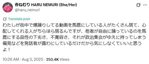 春は参院選の東京選挙区で初当選した参政党さや(本名・塩入清香)氏に対する“怒り”の楽曲「IGMF」が話題になるなど、政治的な発言や楽曲でも知られている。3日の投稿では、1日の街頭宣伝で行ったライブの動画がネット上で拡散される中で、自身をやゆする声なども寄せられたといい「わたしが街中で爆踊りしてる動画を馬鹿にしている人がたくさん居て、心配してくれる人がちらほら居るんですが、他者が自由に踊っているのを馬鹿にする品性の下劣さ、不寛容さ、それが政治集会がゆえに持ってしまう偏見などを発話者が露わにしているだけだから気にしなくていいと思うよ!」とつづっていた。