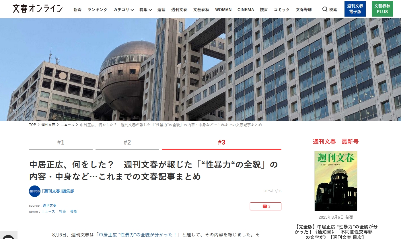 中居氏の女性トラブルを一貫して報じてきた週刊文春は5日、電子版で、『【衝撃スクープ】中居正広「性暴力」の全貌が分かった!《被害内容が記された通知書を入手》前編』と題した記事を配信した。
