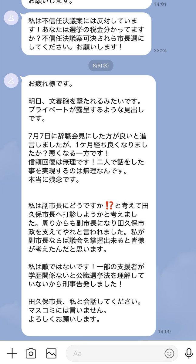 東洋大学歴詐称疑惑に端を発し、約2カ月、辞職発言を撤回するなど不可解な言動を繰り返している静岡県伊東市の田久保真紀市長が11日、X(ツイッター)に投稿。【現在公開できる情報について01 8/11 13時】として「8/6水 に私に送られてきたメッセージ:→私からは返信は無し」と記し、LINEメッセージとみられるスクリーンショット画像をアップした。