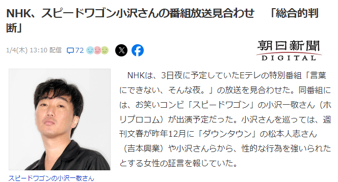 NHKは、3日夜に予定していたEテレの特別番組「言葉にできない、そんな夜。」の放送を見合わせた。同番組には、お笑いコンビ「スピードワゴン」の小沢一敬さん(ホリプロコム)が出演予定だった。小沢さんを巡っては、週刊文春が昨年12月に「ダウンタウン」の松本人志さん(吉本興業)や小沢さんらから、性的な行為を強いられたとする女性の証言を報じていた。