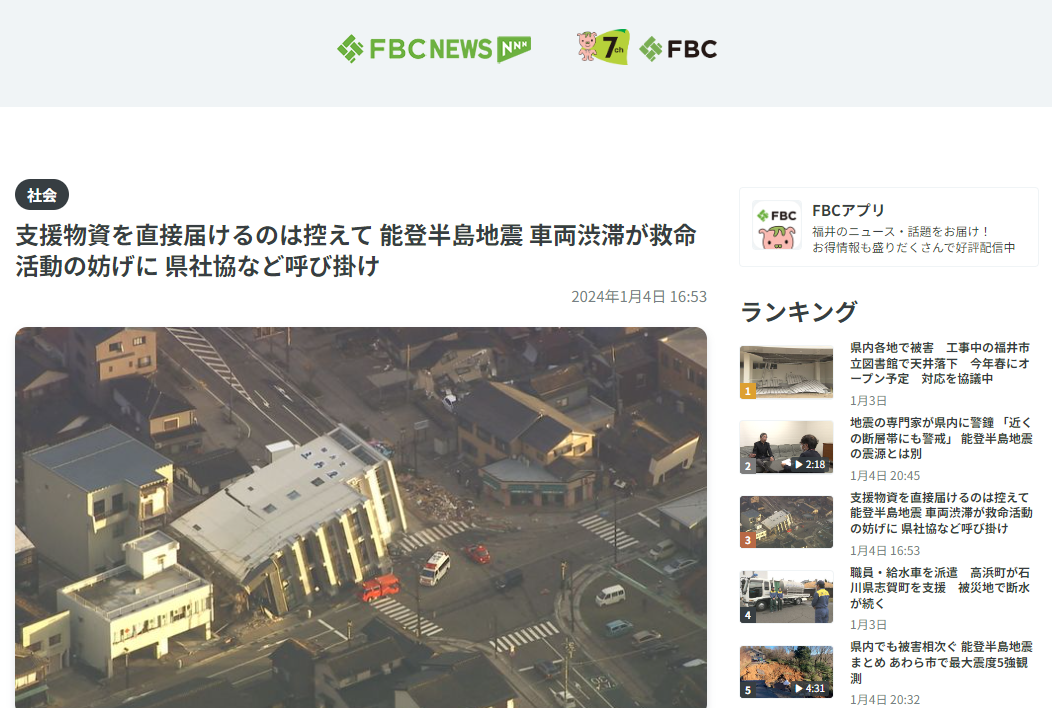 https://news.ntv.co.jp/n/fbc/category/society/fbf4df782944ec447fb38dd4102edc8262能登半島地震の被災地へ続く道路では渋滞が起きていて、石川県や福井県社会福祉協議会は救命活動の妨げになるとして、現時点ではボランティアや支援物資を届けるために現地へ向かうことは控えるよう呼び掛けています。(1月4日)