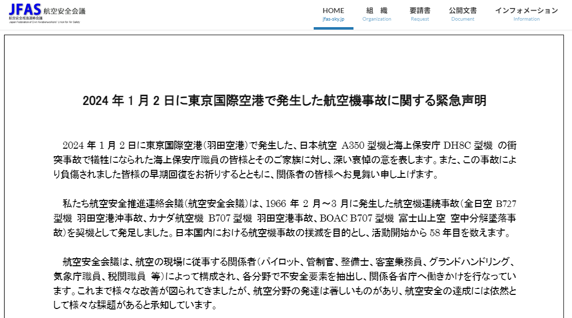 今般、東京国際空港で発生した航空機事故は、残念ながら航空安全が道半ばであることを示すと共に、運輸安全委員会による慎重かつ正確な事故調査が実施されるべきであることは言うまでもありません。従って、憶測を排除し、事実認定のみが唯一かつ最優先であることを正確に理解する必要があります。