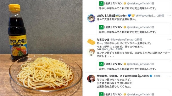 【悲報】ミツカン公式「冷やし中華はつゆだけでも美味しい」と投稿→フェミ、暑さで悪化「あまりにも女性蔑視企業だ」と大炎上