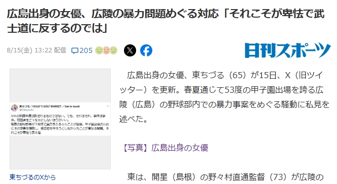 広島出身の女優、東ちづる(65)が15日、X(旧ツイッター)を更新。春夏通じて53度の甲子園出場を誇る広陵(広島)の野球部内での暴力事案をめぐる騒動に私見を述べた。