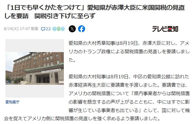 愛知県の大村秀章知事は8月19日、赤澤大臣に対し、アメリカのトランプ政権による関税措置の見直しを要請しました。