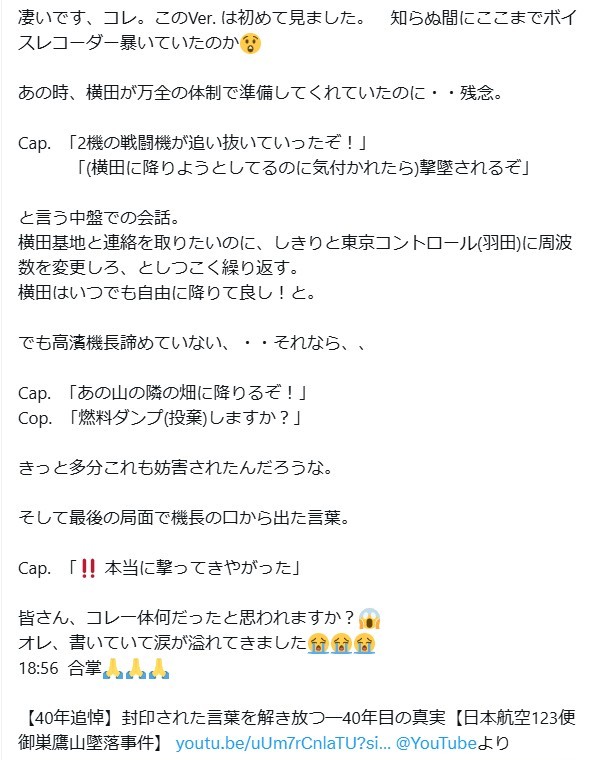 投稿は「【40年追悼】封印された言葉を解き放つ─40年目の真実【日本航空123便御巣鷹山墜落事件】」というYouTube動画を添付している。8月18日現在、この動画は48万回以上再生されている。