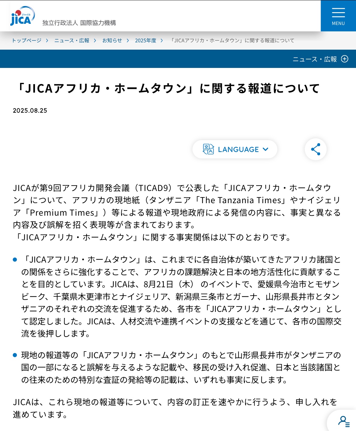 1: 名無し 2025/08/26(火) 14:03:30.62 ID:ovwb5+dv0JICAが第9回アフリカ開発会議(TICAD9)で公表した「JICAアフリカ・ホームタウン」について、アフリカの現地紙(タンザニア「The Tanzania Times」やナイジェリア「Premium Times」)等による報道や現地政府による発信の内容に、事実と異なる内容及び誤解を招く表現等が含まれております。■応援クリック感謝