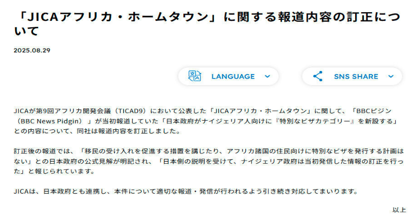 【速報】ホームタウン事業「BBCが報道内容を訂正」JICAが報告
