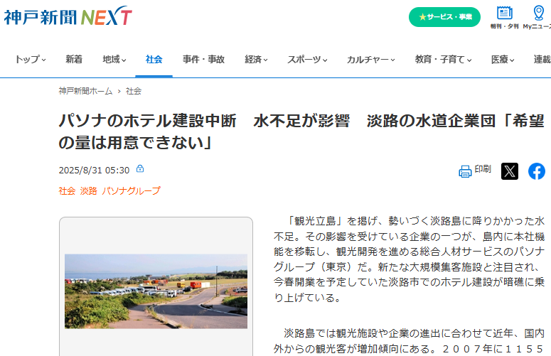 【速報】本社機能も移転した淡路島のパソナ、ホテル建設中断「水不足が影響」淡路の水道企業団「希望の量は用意できない」