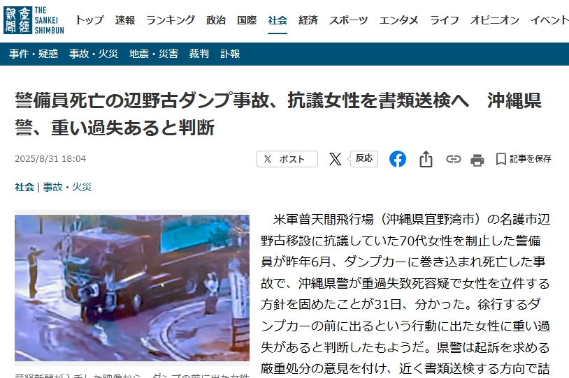 米軍普天間飛行場(沖縄県宜野湾市)の名護市辺野古移設に抗議していた70代女性を制止した警備員が昨年6月、ダンプカーに巻き込まれ死亡した事故で、沖縄県警が重過失致死容疑で女性を立件する方針を固めたことが31日、分かった。徐行するダンプカーの前に出るという行動に出た女性に重い過失があると判断したもようだ。県警は起訴を求める厳重処分の意見を付け、近く書類送検する方向で詰めの捜査を進めている。