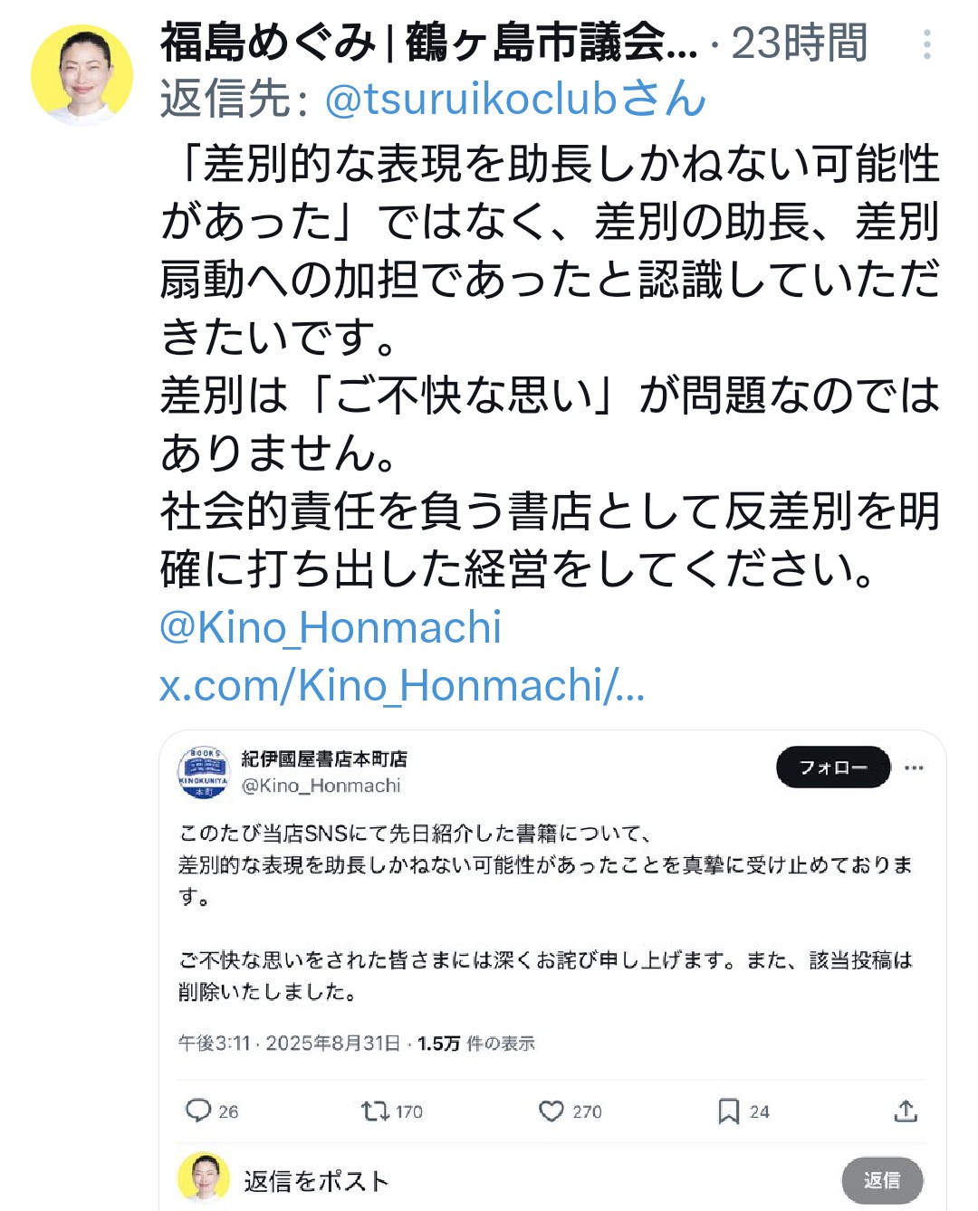 大型書店チェーン・紀伊國屋書店の本町店(大阪市中央区)が2025年8月31日、Xでの書籍紹介の投稿について、謝罪の上で削除した。