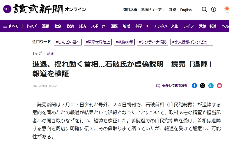 読売新聞は7月23日夕刊と号外、24日朝刊で、石破首相(自民党総裁)が退陣する意向を固めたとの報道が結果として誤報となったことについて、取材メモの精査や担当記者への聞き取りなどを行い、経緯を検証した。(略)