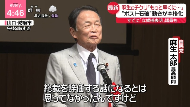 【辞任もっと早く言ってくれれば】自民党・麻生太郎最高顧問「まさか、きのう、石破総理大臣が辞められるという、総裁を辞任する話になるとは思ってなかったんですけど、どうせならもっと早く言ってくれれば良かったのに…」
