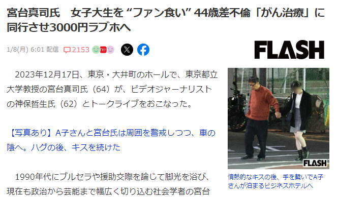 東京都立大学教授の宮台真司、17歳長女と年の近い20歳学生とラブホも「男女関係否定」週刊誌「がん治療同伴して車内で◯◯してた」
