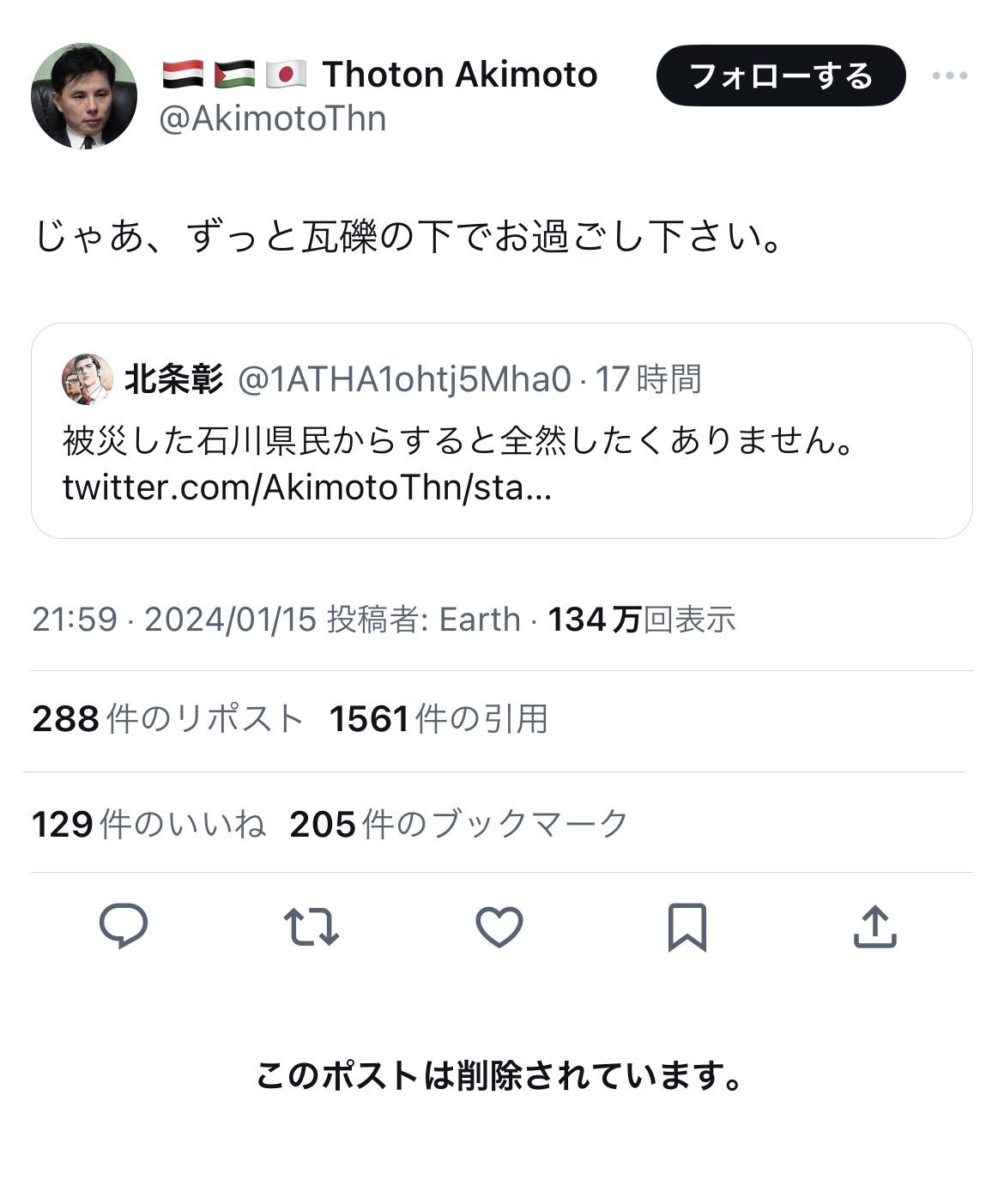 【速報】「(山本太郎批判して石川被災者に)瓦礫の下でお過ごしください」と暴言で話題になったあのジャーナリスト、謝罪「つい感情的に」