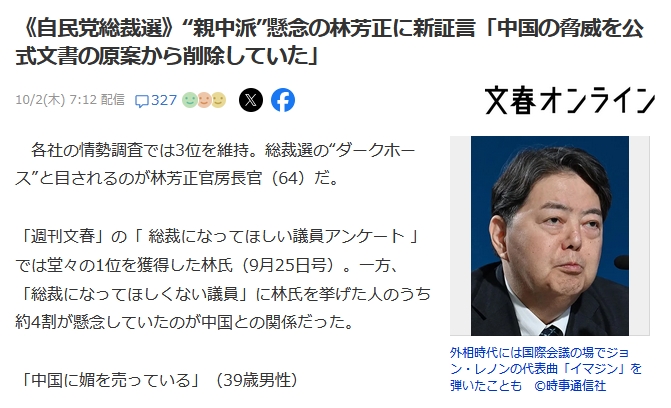 自民党総裁選に立候補している林芳正前外相について、新たな証言が浮上した。関係者によると、外相在任中に安全保障関連の公式文書原案から「中国の脅威」という表現を削除していたとされる。総裁選をめぐっては林氏が「親中派」と見られることへの懸念が一部から出ており、今回の証言がそうした見方をさらに強める可能性がある。