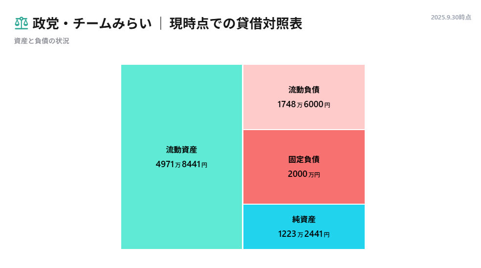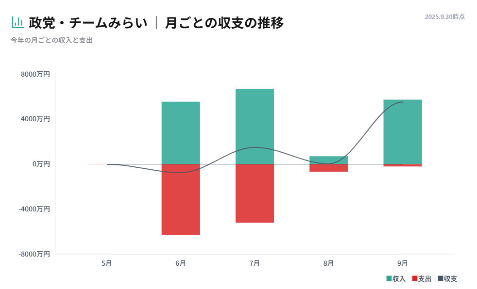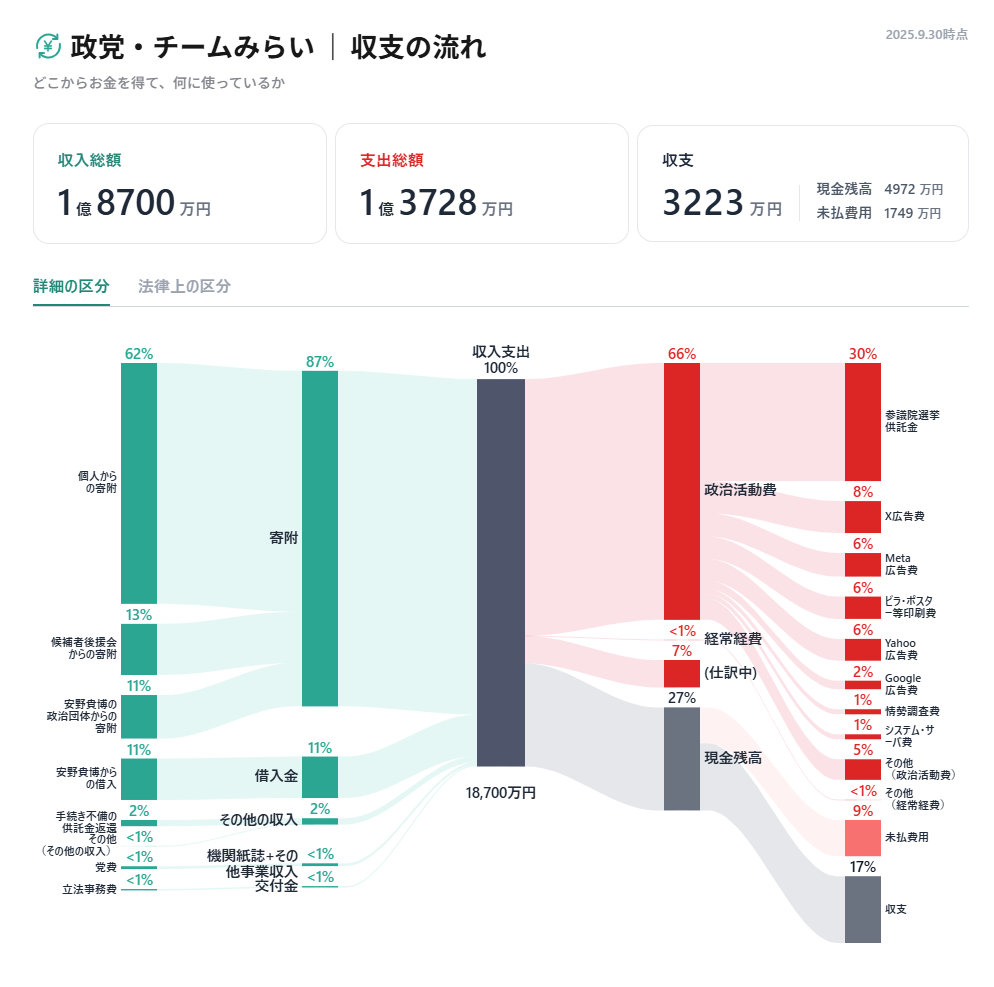 政党「チームみらい」は10月2日、政治資金を可視化するツール「みらい まる見え政治資金」を発表した。特設サイトを開設しており、サンキー図で可視化した同党の収支を公開中。ツールはオープンソースとしても公開しており、全ての議員・政治団体が使えるようにした。