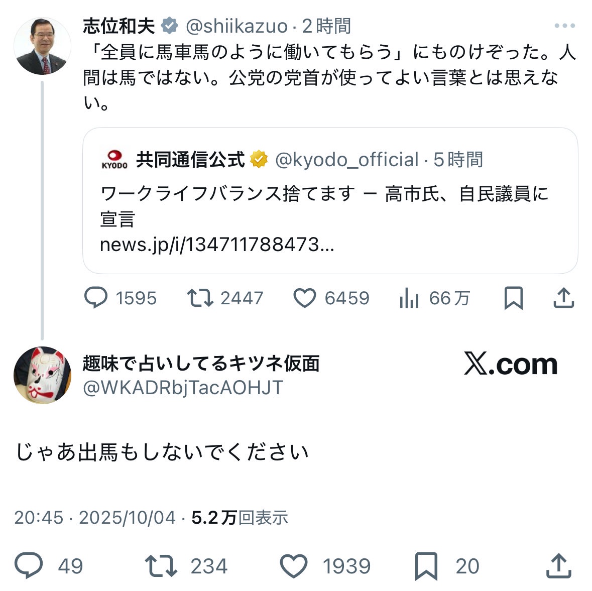 【悲報】共産党「馬車馬のように働く?人間は馬ではない。党首が使ってよい言葉とは思えない」SNS「じゃあ出馬もしないでください」