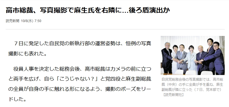高市総裁、写真撮影で麻生氏を右隣に…後ろ盾演出か https://topics.smt.docomo.ne.jp/article/yomiuri/politics/20251007-567-OYT1T50257
