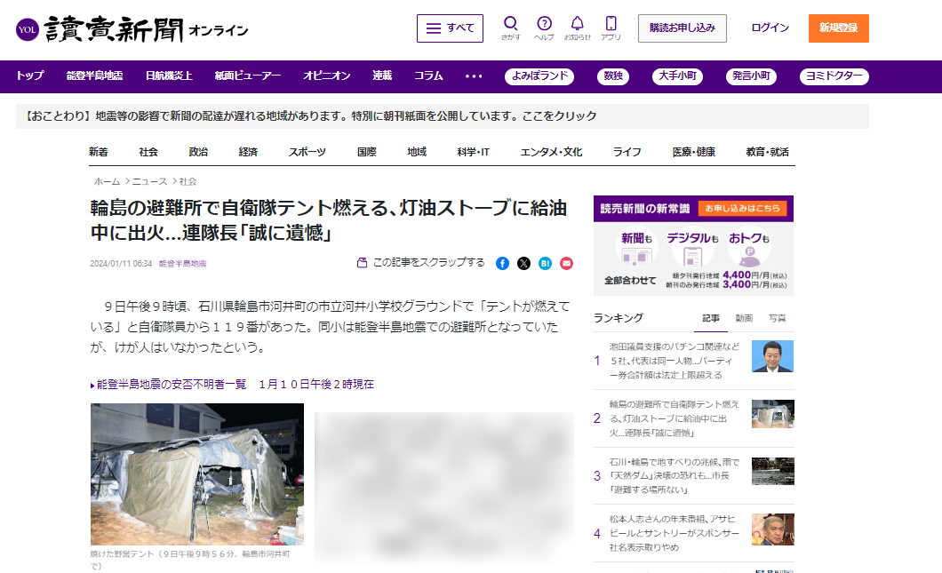 輪島の避難所で自衛隊テント燃える、灯油ストーブに給油中に出火…連隊長「誠に遺憾」