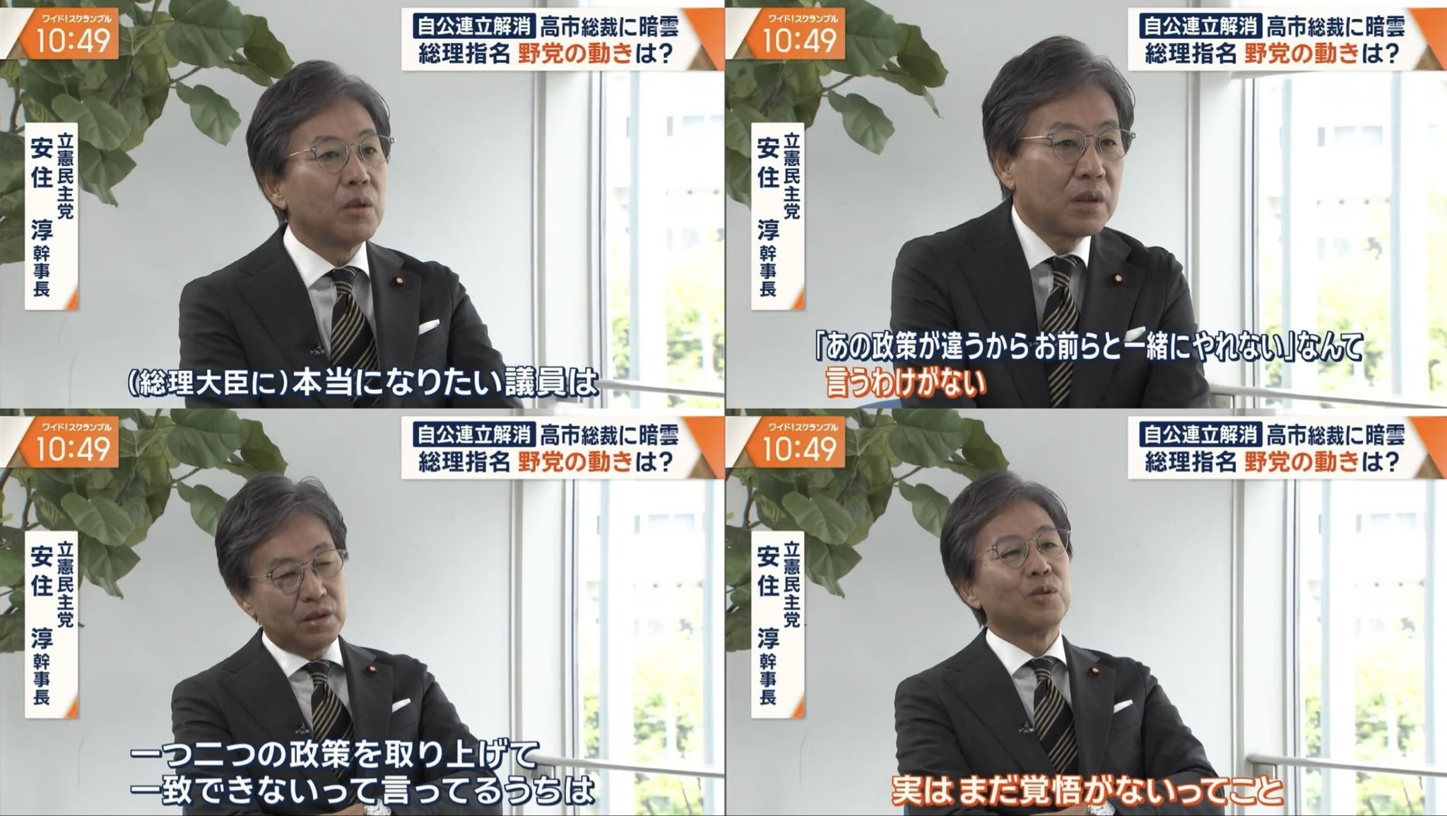 首相指名選挙での野党候補一本化を巡り、「一つ二つの政策を取り上げて『一致できない』と言っているうちは、まだ覚悟がないということだ」と述べた。