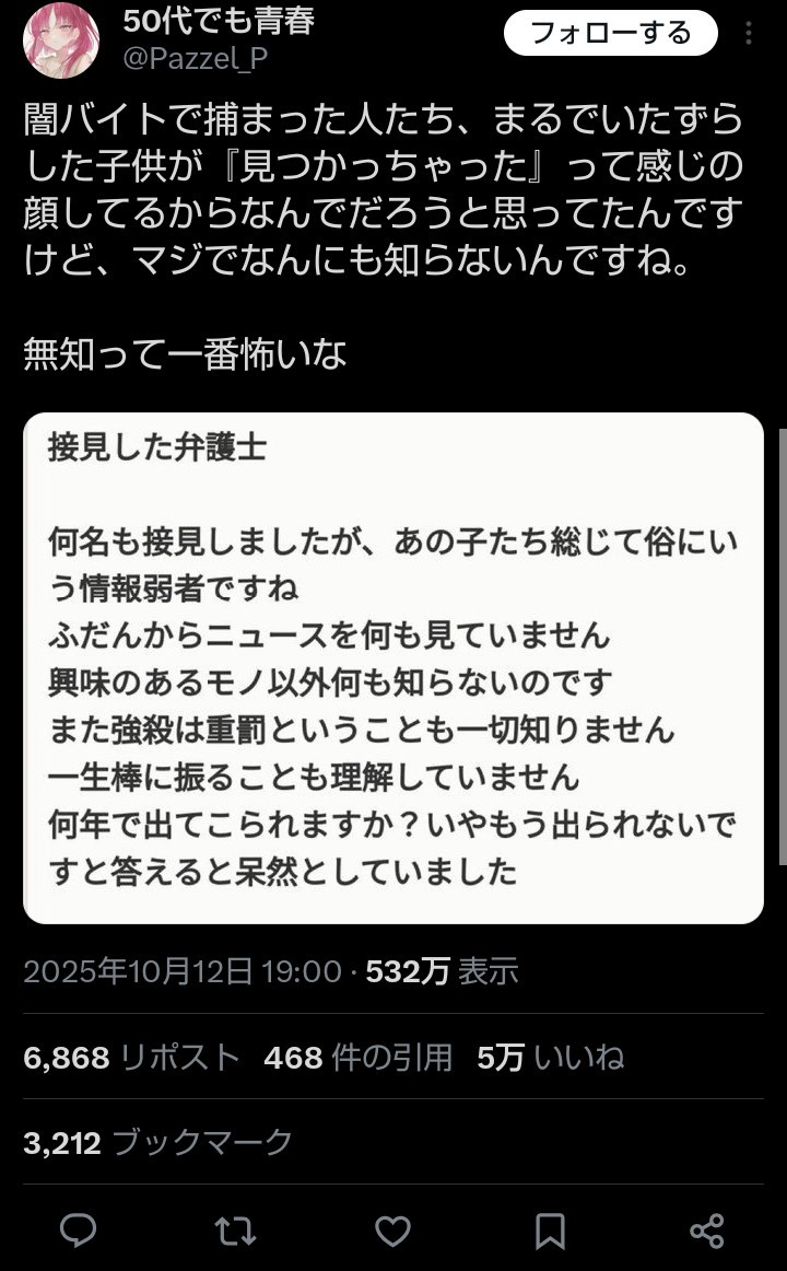 闇バイト「何年で出られそうですですか?」弁護士「恐らく一生刑務所です」闇バイト「え、そうなの?」 2025年10月14日 最終更新日時 : 2025年10月14日 loki.5ch.net カープドラ6西川篤夢!「日本を代表する遊撃手になりたい」【ドラフト会議2025】 カープドラ5赤木晴哉!191cm最速153キロ!佛教大の本格派右腕!【ドラフト会議2025】 カープドラ4工藤泰己!159キロ北の剛腕!【ドラフト会議2025】 カープドラ3勝田成!近畿大163cmセカンド!菊池涼介の後継者候補!【ドラフト会議2025】 カープドラ2齊藤汰直!亜大152キロエース!【ドラフト会議2025】 カープドラ1平川蓮!187cmのスイッチヒッター!立石正広を外し2度目の重複も新井監督がクジを引き当てる!【ドラフト会議2025】 【カープ実況】ドラフト会議2025!ドラ1立石正広の獲得なるか 緒方孝市カープドラ3指名で青学出禁!澤﨑俊和の逆指名まで10年間スカウト出禁 【朗報】広島、攻守最強都市だったwww 【悲報】彼女「ごめん!俺くんの貯金、情報商材に使っちゃった」→…問い詰めたらギャン泣きされたんだが俺が悪いのか? 闇バイト「何年で出られそうですですか?」弁護士「恐らく一生刑務所です」闇バイト「え、そうなの?」 1: 名無し 2025/10/13(月) 20:28:37.84 ID:ZffdVjca0 創価学会職員「参院選もボロ負け、負け続きで自民と一緒にやる意味がなくなった」 公明元国会議員「連立離脱は既定路線なっていた」 【大悲報】 インドネシア「中国に作ってもらった高速鉄道が赤字になった なんとかしろ」 【速報】 立民の野田代表 、首相指名候補に『あの人物の名前』をあげてしまうwwwwww 続きを読む 続きを見る カープドラ6西川篤夢!「日本を代表する遊撃手になりたい」【ドラフト会議2025】 カープドラ5赤木晴哉!191cm最速153キロ!佛教大の本格派右腕!【ドラフト会議2025】 カープドラ4工藤泰己!159キロ北の剛腕!【ドラフト会議2025】 カープドラ3勝田成!近畿大163cmセカンド!菊池涼介の後継者候補!【ドラフト会議2025】 カープドラ2齊藤汰直!亜大152キロエース!【ドラフト会議2025】 カープドラ1平川蓮!187cmのスイッチヒッター!立石正広を外し2度目の重複も新井監督がクジを引き当てる!【ドラフト会議2025】 【カープ実況】ドラフト会議2025!ドラ1立石正広の獲得なるか 緒方孝市カープドラ3指名で青学出禁!澤﨑俊和の逆指名まで10年間スカウト出禁 関連記事 「ラストダンジョンの入り口が始めの村のすぐそばにある」←これ好き 【悲報】河合・フィフィ「不法移民は駄目」弁護士「改法したのにそれ以上に虐める必要があるのか」河フィ「いじめる!?」弁「たった2千人でしょ」