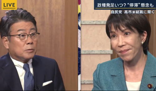 10月9日放送の『報道ステーション』(テレビ朝日系)で、大越健介キャスターが高市早苗新総裁に行ったインタビュー内容が物議を醸している。