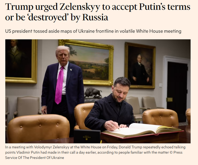 新着:ホワイトハウスでの緊張した会談で、トランプはゼレンスキーにプーチンの和平条件——ドンバス地域の放棄——を受け入れるか、ロシアによる「破壊」に直面するかと迫った。会談は叫び声が飛び交うまでに発展し、トランプはウクライナの戦場地図を無視し、以前の電話でプーチンが述べた主張を繰り返した。