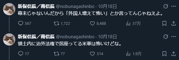 【悲報】 パ 「幕末じゃないんだから「外国人増えて怖い」とか言ってんじゃねえ。米軍は怖いけどな」