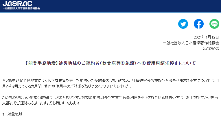 また、甚大な被害を受けた地域の契約者のうち、飲食店等の施設での音楽利用者を対象とし、「1月から3月までの3カ月間、著作物使用料のご請求を取りやめることといたしました」と発表。
