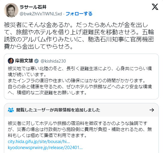 能登半島地震の2次避難めぐるSNS投稿が騒動タレントのラサール石井(68)が14日、自身のX(旧ツイッター)を更新。能登半島地震で被災した人たちの避難先について書き込み、物議を醸した12日の自身のX投稿について「ホテルや旅館が有料であるかのような誤情報を流す結果になりました。被災地の皆様にはただならぬご迷惑をお掛けしたことを深くお詫びします」などと陳謝した。